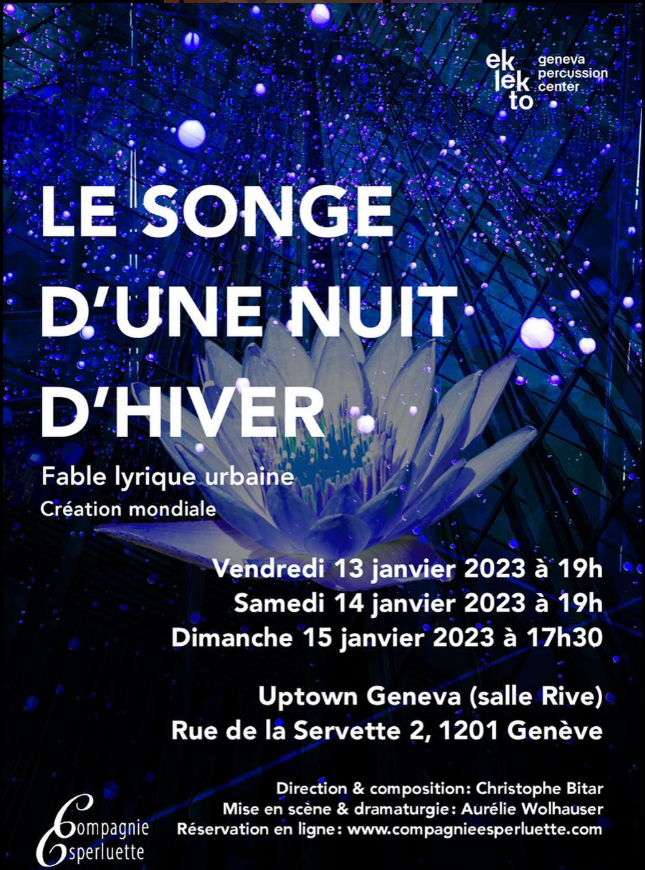 En janvier 2023, la Compagnie Esperluette, troupe artistique de jeunes musicien-nes genevois-es, joue, en création mondiale, Songe d’une Nuit d’Hiver, librement inspirée du Midsummer Night’s Dream de William Shakespeare. La pièce est signée Aurélie Wolhauser (dramaturgie) et Christophe Bitar (composition). Elle prend la forme d’un opéra contemporain – 1h20 de musique – pour sept chanteur-euses solistes, chœur de femmes et ensemble instrumental (saxophone, cor, violoncelle, piano et percussions).